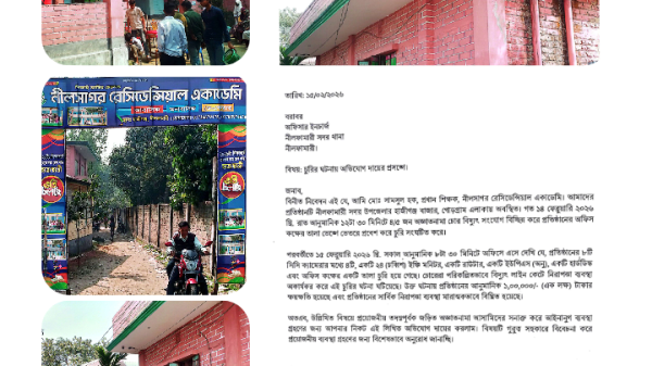 নীলফামারী সদর উপজেলার হাজীগঞ্জ বাজারের নীলসাগর রেসিডেন্সিয়াল একাডেমিতে দুঃসাহসিক চুরির ঘটনা ঘটেছে। এতে মূল্যবান সরঞ্জাম সহ আনুমানিক এক লাখ টাকার ক্ষয়ক্ষতি হয়েছে। প্রতিষ্ঠান কর্তৃপক্ষ ইতিমধ্যেই নীলফামারী সদর থানায় অভিযোগ দায়ের