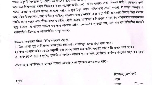 তথ্য অধিকার আইন, ২০০৯ অনুযায়ী তথ্য জানতে চাওয়াকে কেন্দ্র করে নীলফামারী সদর উপজেলার একটি সরকারি প্রাথমিক বিদ্যালয়ের প্রধান শিক্ষকের বিরুদ্ধে আবেদনকারীদের হেনস্তা, লাঞ্ছিতকরণ ও ভয়ভীতি প্রদর্শনের অভিযোগ উঠেছে। অভিযোগ সূত্রে